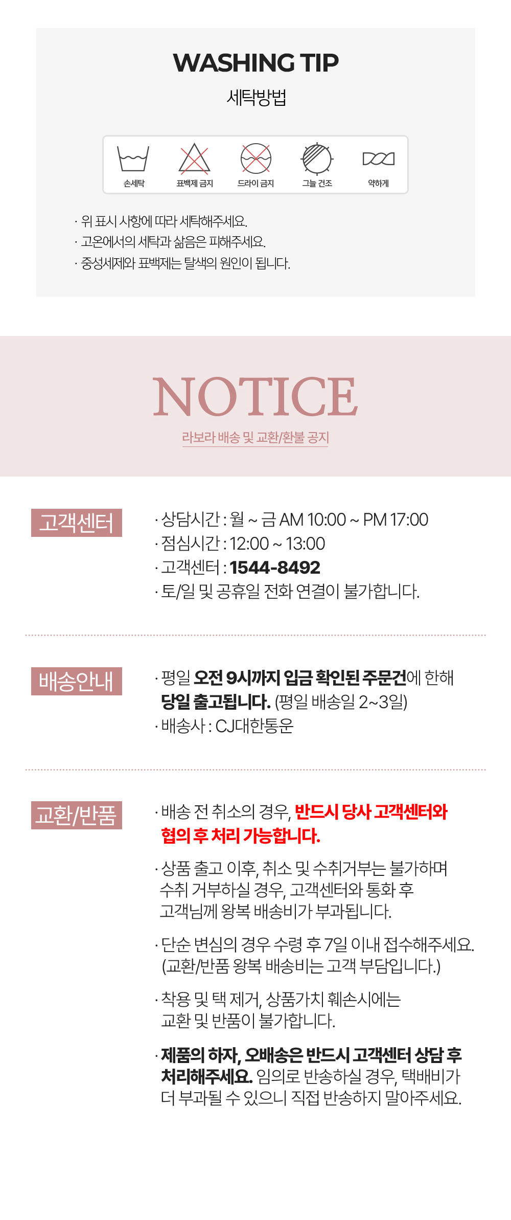 • * 세탁방법 - 손세탁 권장 / 표백제 사용 금지 / 드라이 금지 / 그늘 건조 / 약하게 비틀어 짤기 - 고온에서 세탁과 삶는 것 금지 - 다른 의류와 함께 세탁 금지 - 불가피하게 세탁기 혹은 건조기 사용시 반드시 세탁 전용망 사용 * 단순 변심과 권유하지 않은 세탁 방법 및 건조로 인한 제품 품질 문제를 제외한 일반적인 제품 하자에 대해서 보상